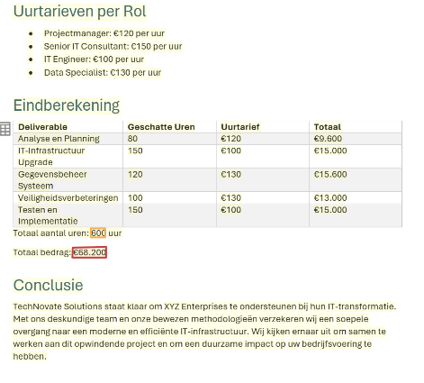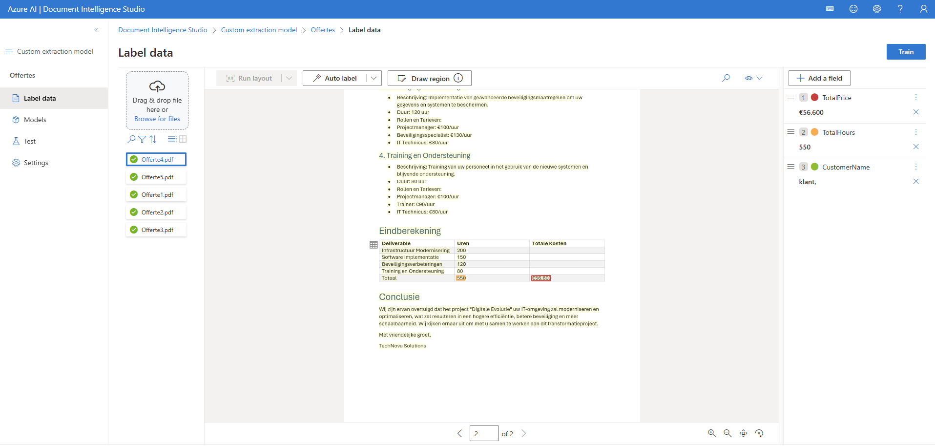 In the screenshots above the total amount of hours and the total cost have been marked. As you can see every quote has a slightly different way of showing this total. To make a system which can handle all of these different cases I decided to use Azure AI Document Intelligence. With this tool an AI can be trained with just a couple of documents, after it you can have it analyze and extract data using that model.