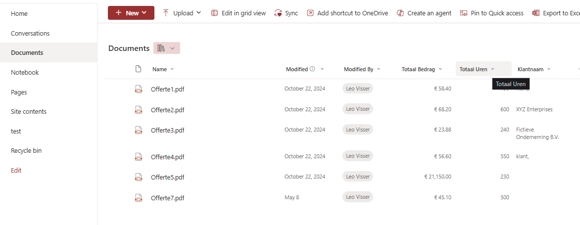 The screenshot above shows how these columns can look. To test their idea I made this setup where I have some quotes (the Dutch word for that is “Offerte” so that’s why you’ll see that word in the screenshots). Some values I want to extract from them might be the total amount quoted and the totals hours quoted, and I might also want to have the name of the customer.