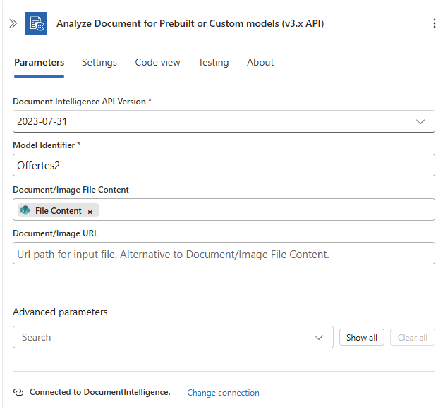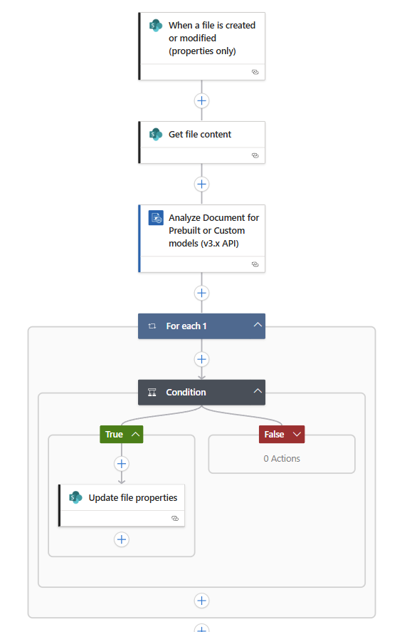 This flow will trigger once a document is uploaded in the specified SharePoint location. Once it’s triggered it will retrieve the full file and then run the document intelligence job.